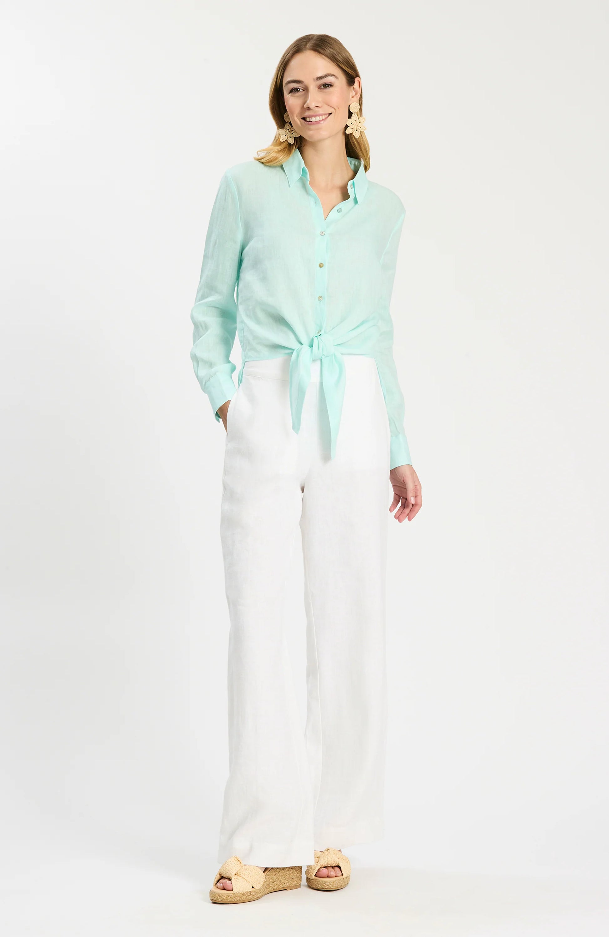 A warm-weather wardrobe staple crafted in breathable linen, the Amara Shirt features a classic button-front silhouette and a flattering tie-front detail that defines the waist with effortless polish. Easy, versatile, and timeless, it pairs perfectly with white denim or linen trousers for an elevated everyday summer look.