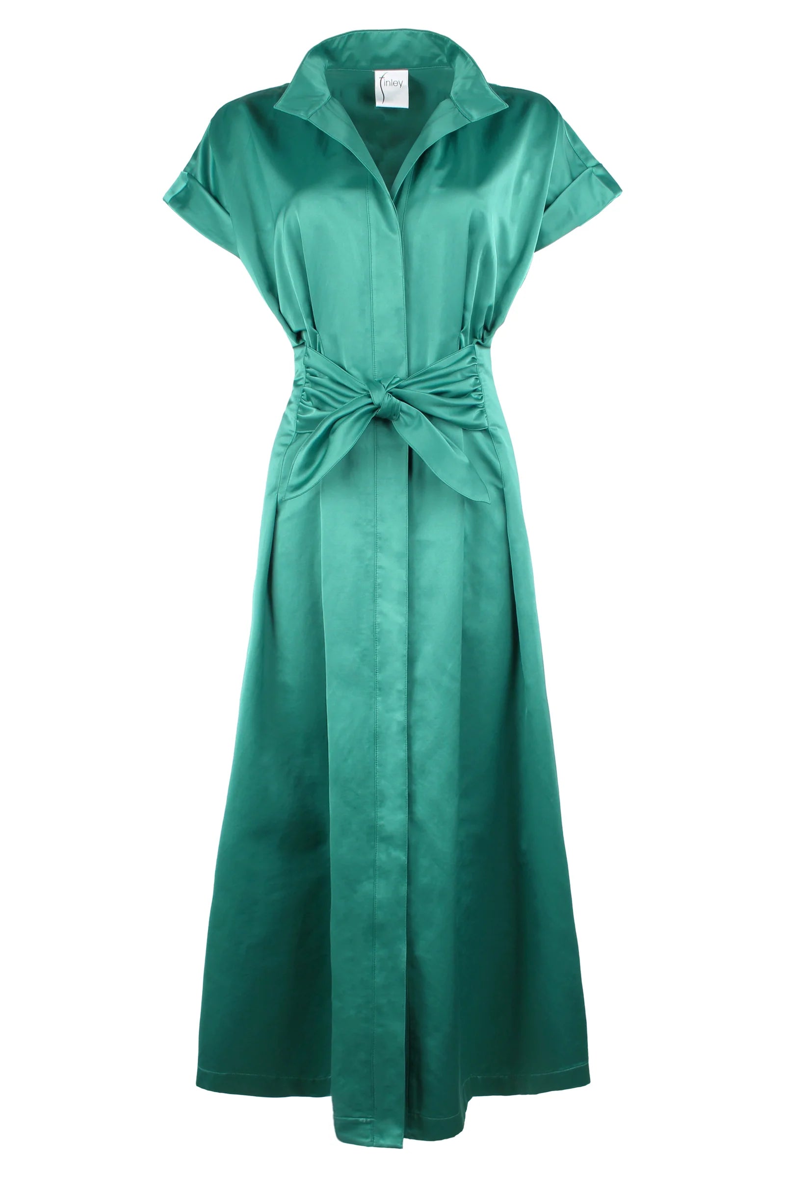- Tie front emerald green fit and flare dress with hidden front button placket in a polyester/cotton satin