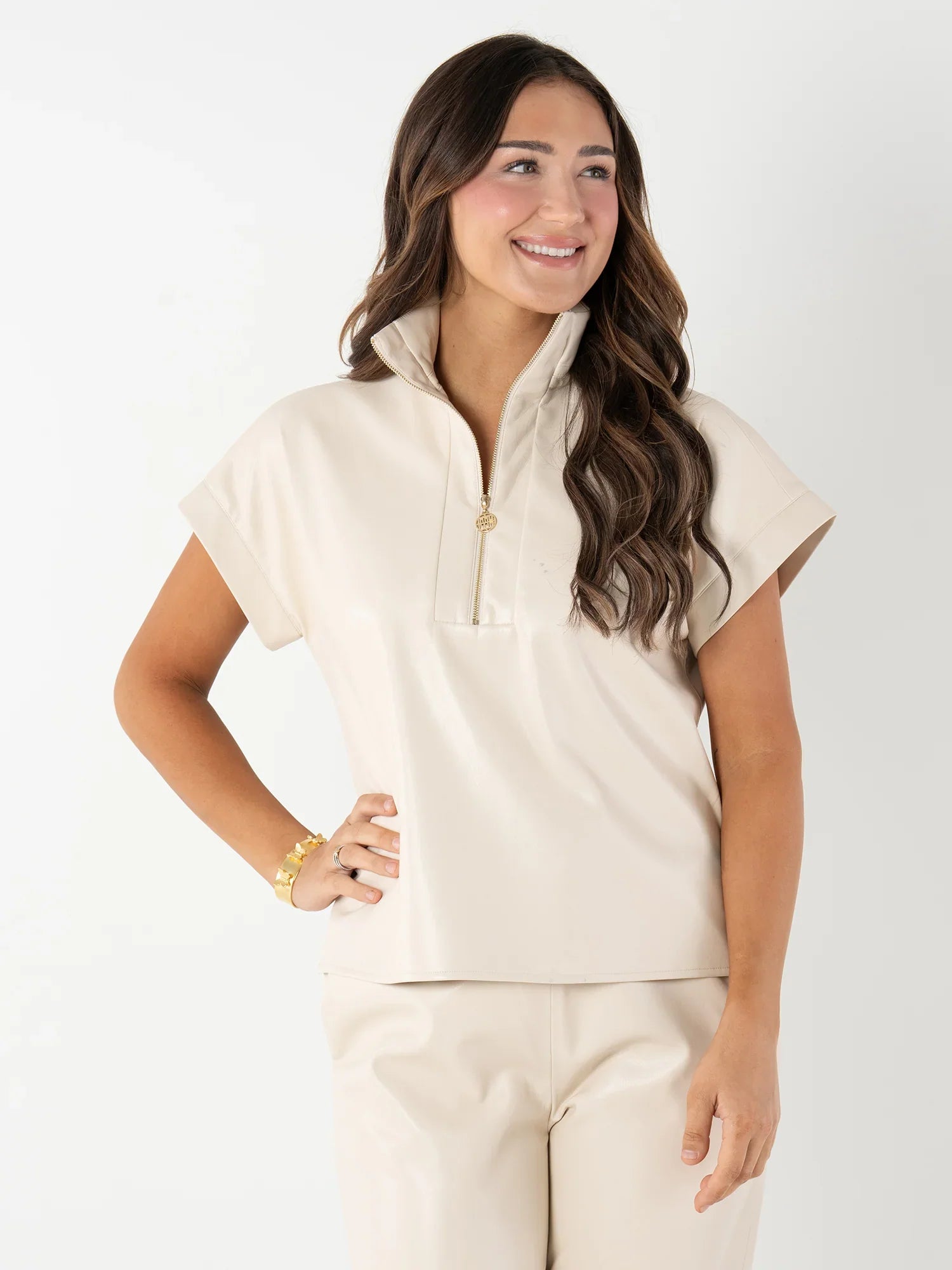 A fresh update to a signature silhouette, the Poppy Pullover in Sandshell Vegan Leather features a stand collar with a 3/4 zip neckline and our signature gold logo pull. Short dolman sleeves add ease, while the buttery soft, lightweight vegan leather offers both structure and comfort. Polished yet practical, this top is the perfect piece for transitioning into fall with effortless style. Pair with the coordinating Tailored Short for an easy and polished matching set.